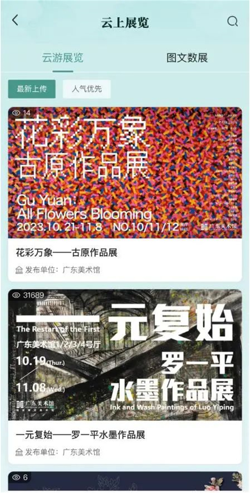 “文化广东”平台逛展览板块,汇集了8000余件美术展品、45部VR云展、15场线下展览。指尖轻点,即可沉浸于绚丽多彩的广东艺术世界。