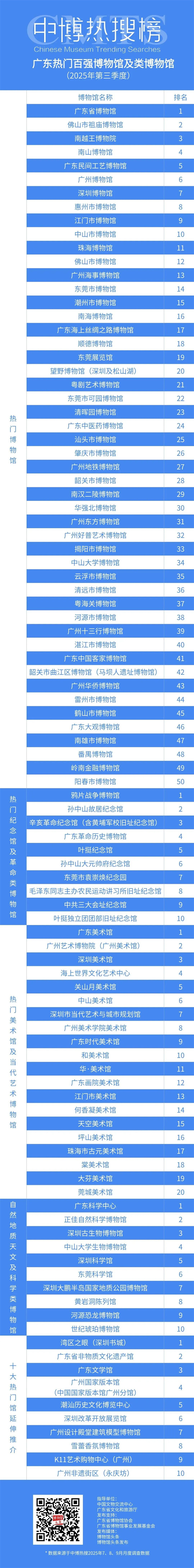 与此同期,由广东省文化和旅游厅指导,广东省博物馆协会、广东省博物馆事业发展基金会和博物馆头条联合发布的2025年第三季度广东省热门百强博物馆榜单出炉。