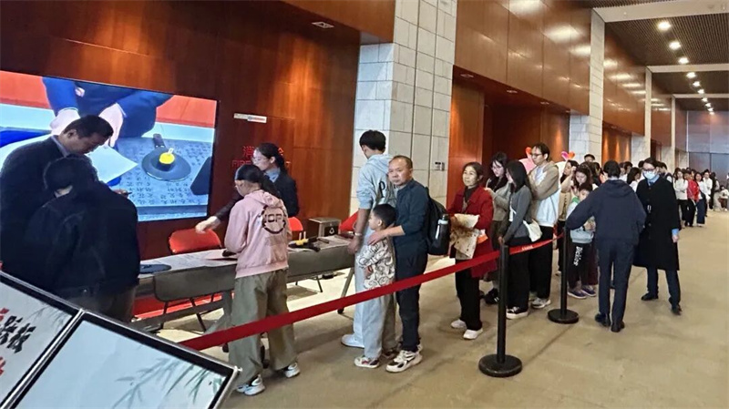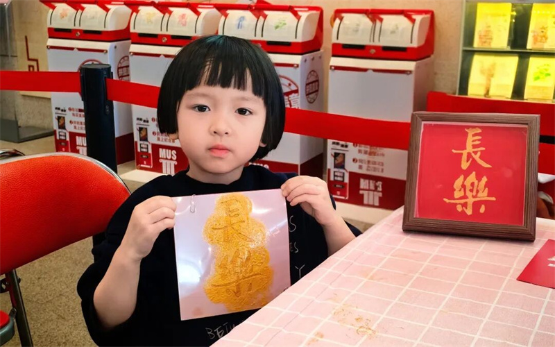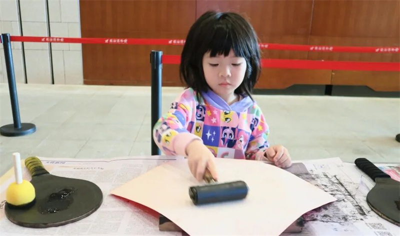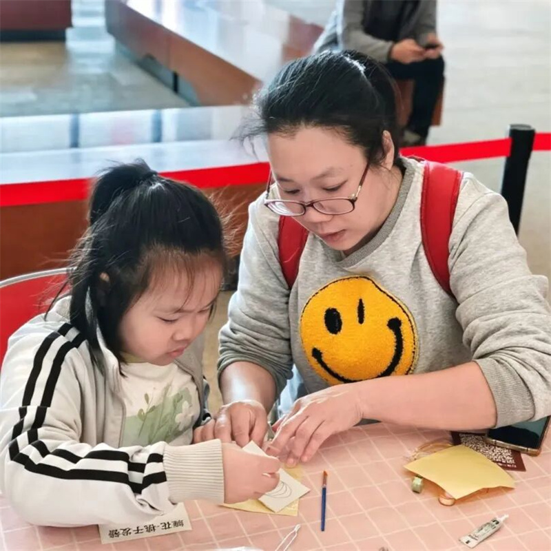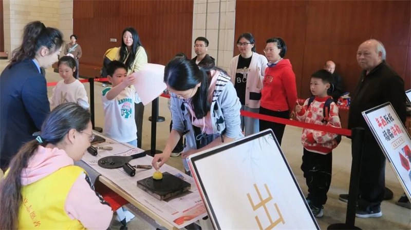 下午的一楼序厅,镂空拓印活动人气爆棚。参与者凭预约信息领取专属工具套装,遵循“少蘸多次”的金墨使用诀窍,在工作人员指导下固定纸张、均匀拓印,短短15分钟便收获一幅亮泽清晰的吉祥纹样。