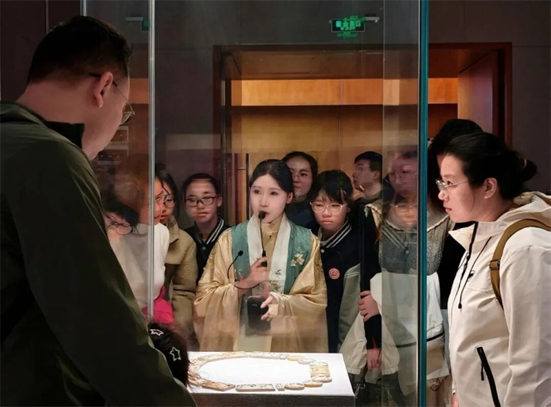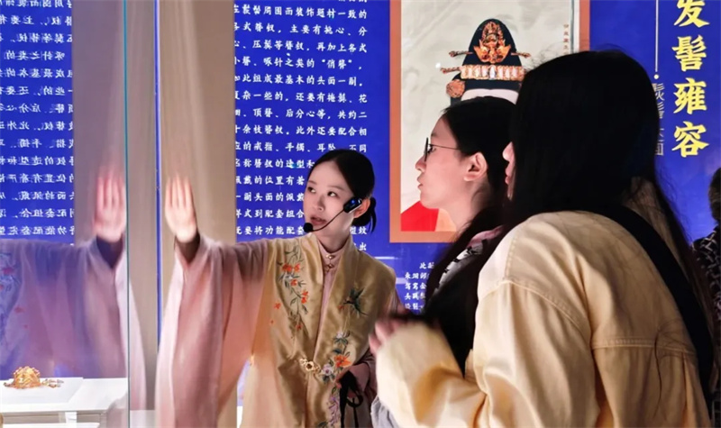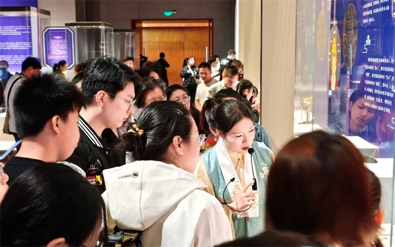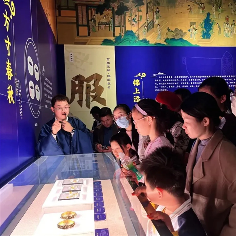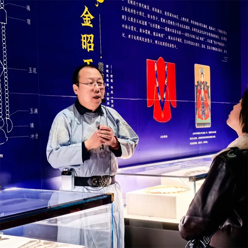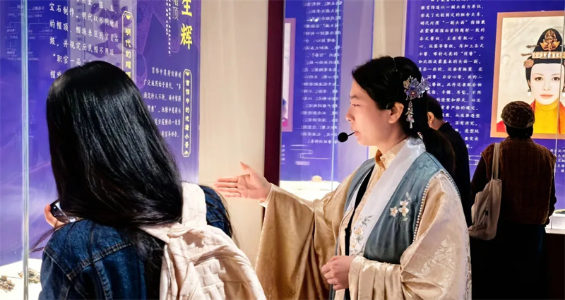 移步第四展厅,一场穿越时空的汉服特色讲解正在进行。身着明制汉服的讲解员,以生动鲜活的语言,串联起明代王妃首饰的华美精巧与藩府往事的传奇故事。