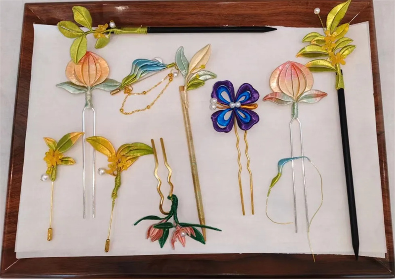 元旦上午的一楼序厅,缠花发簪体验活动温情启幕。16组参与者手持馆方免费提供的材料包,在工作人员的细致指导下,剪形、缠线、组装、定型,将丝线与饰珠巧妙搭配,铃兰、桂花等吉祥纹样在指尖绽放。
