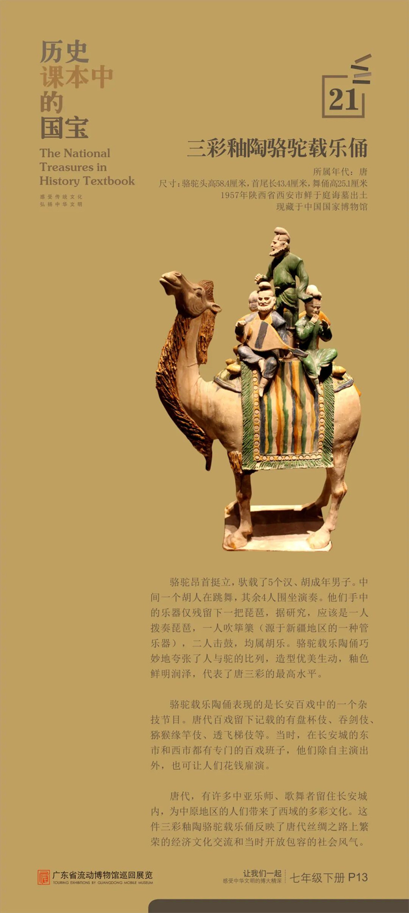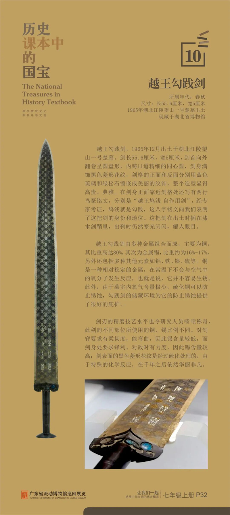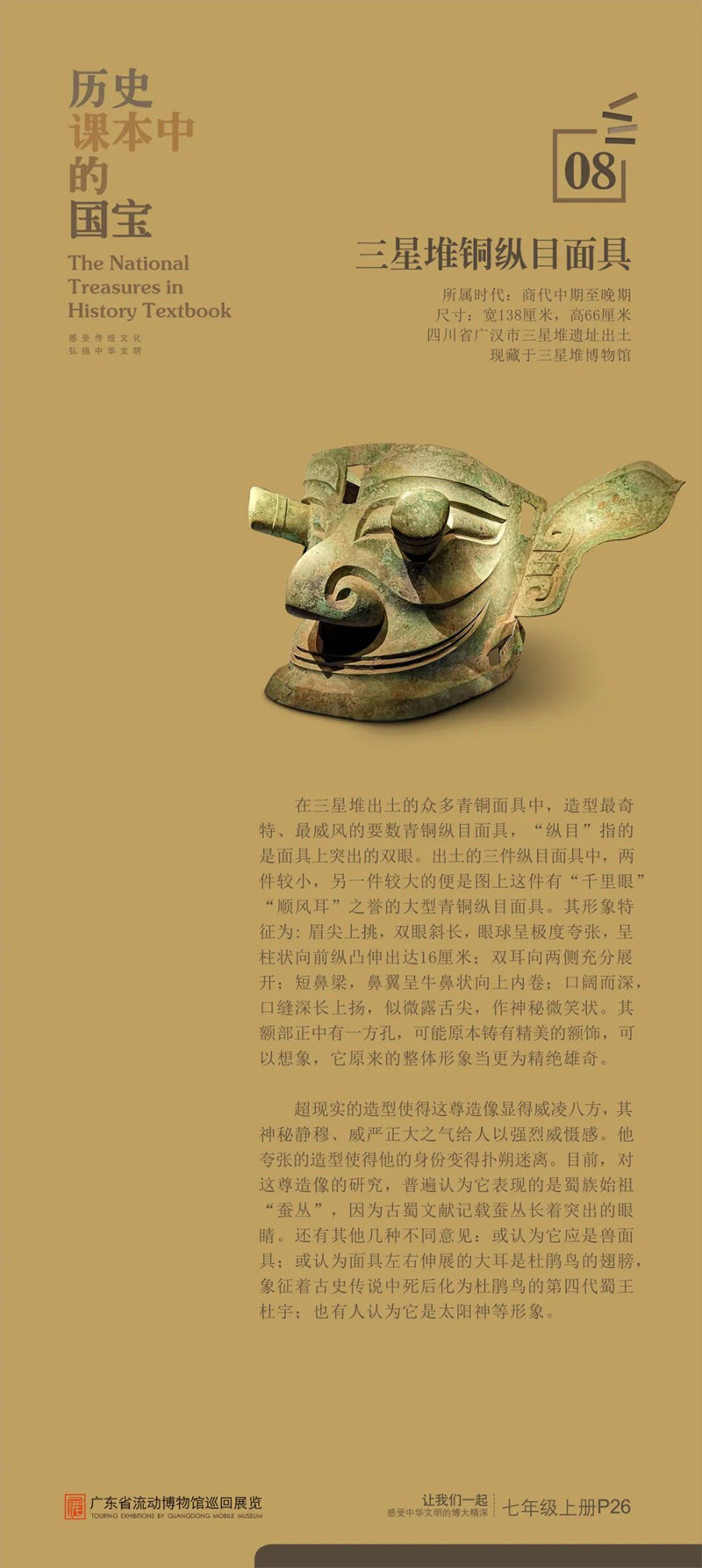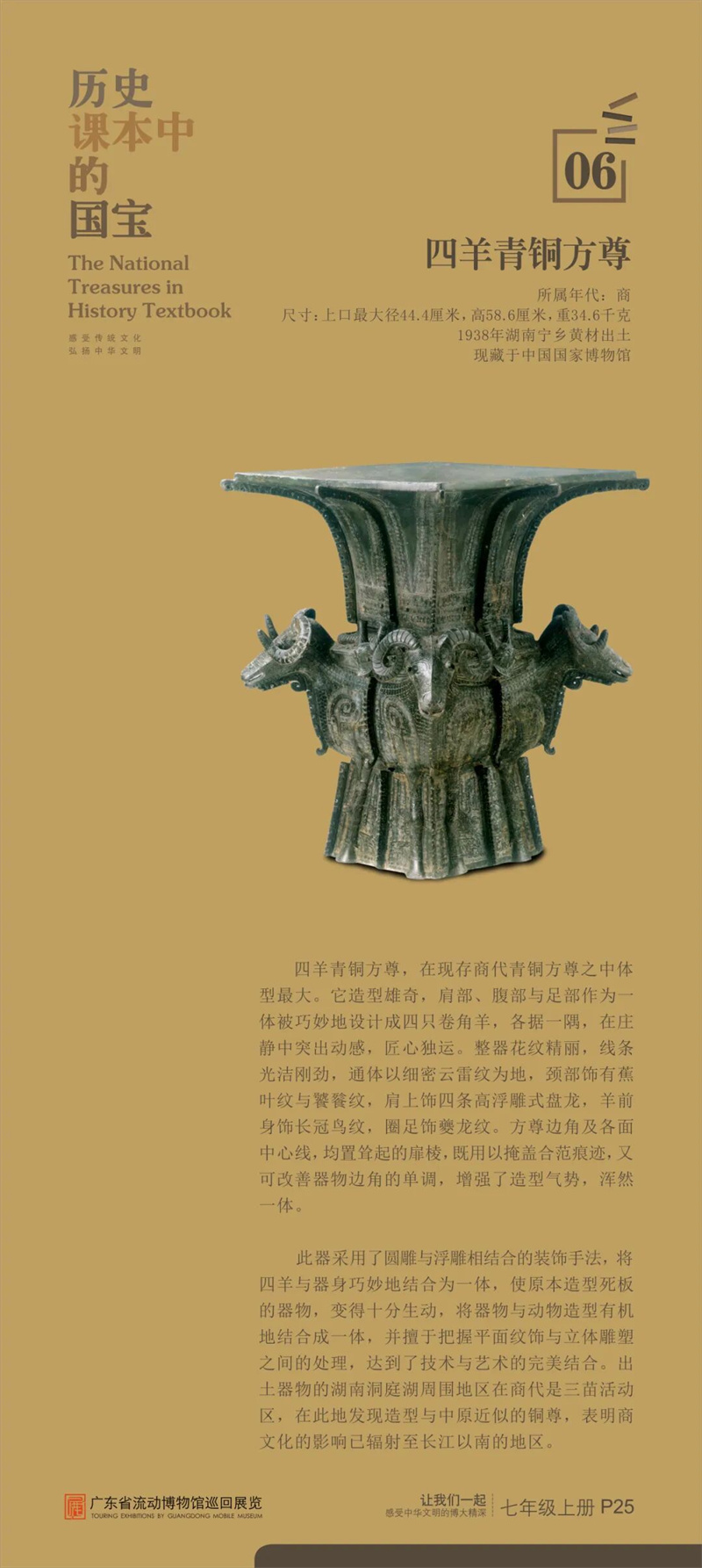 “历史课本中的国宝”是东莞市博物馆首次对接中学历史课本内容设计的流动展览,从历史课本中甄选25件具有重大历史、文化、艺术价值的古代文物,通过图片展讲述“国宝”的前世今生,在课本知识之外呈现新的历史风貌和价值精髓,给同学们提供一架“时光机”,在“时光通道”中感受中华文明之大美。