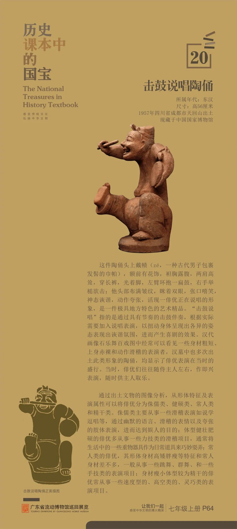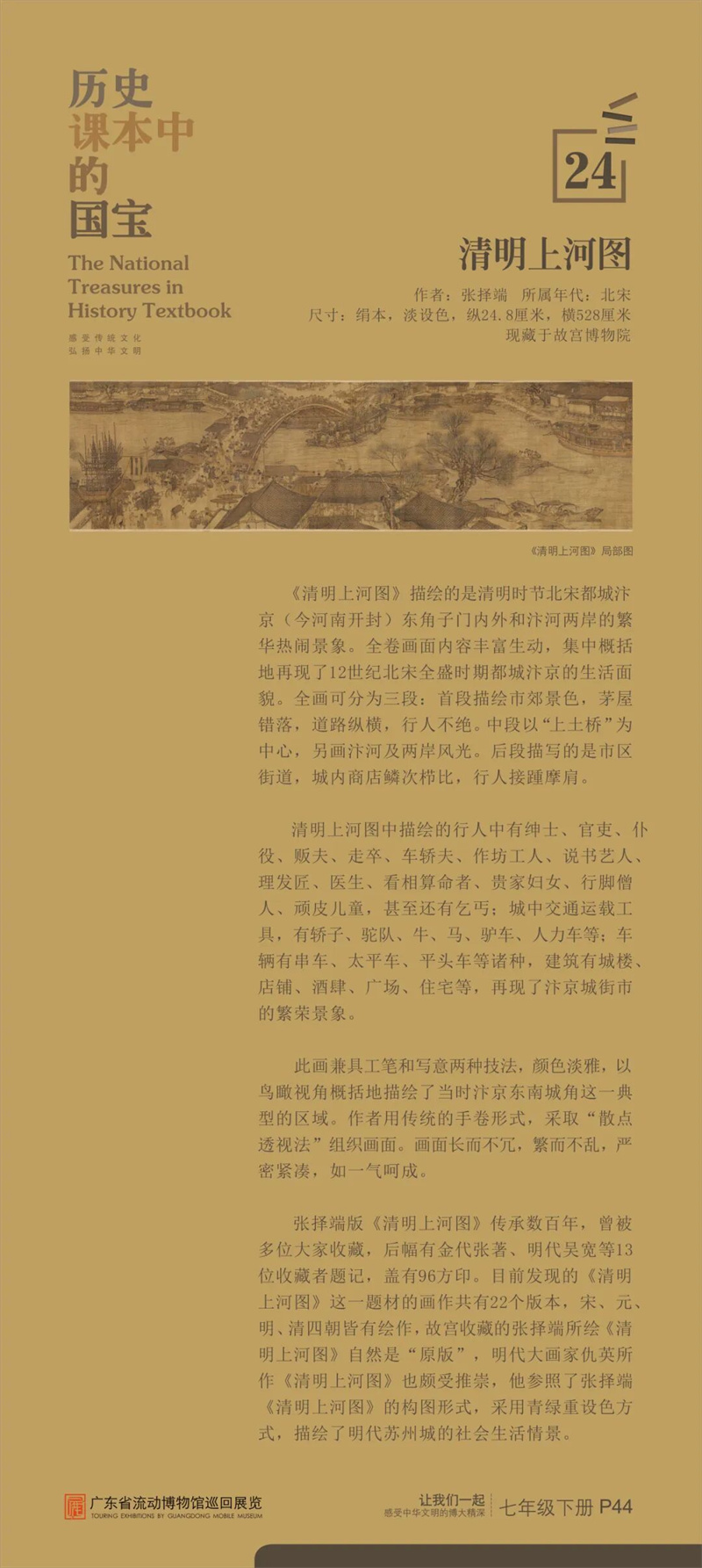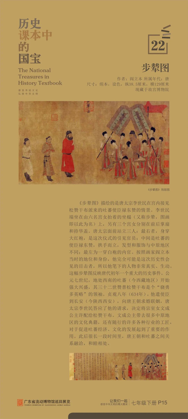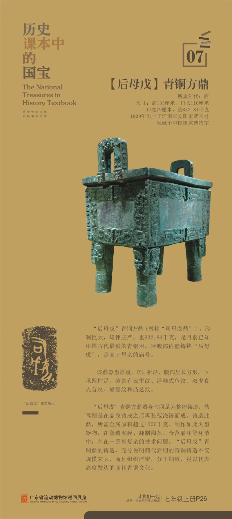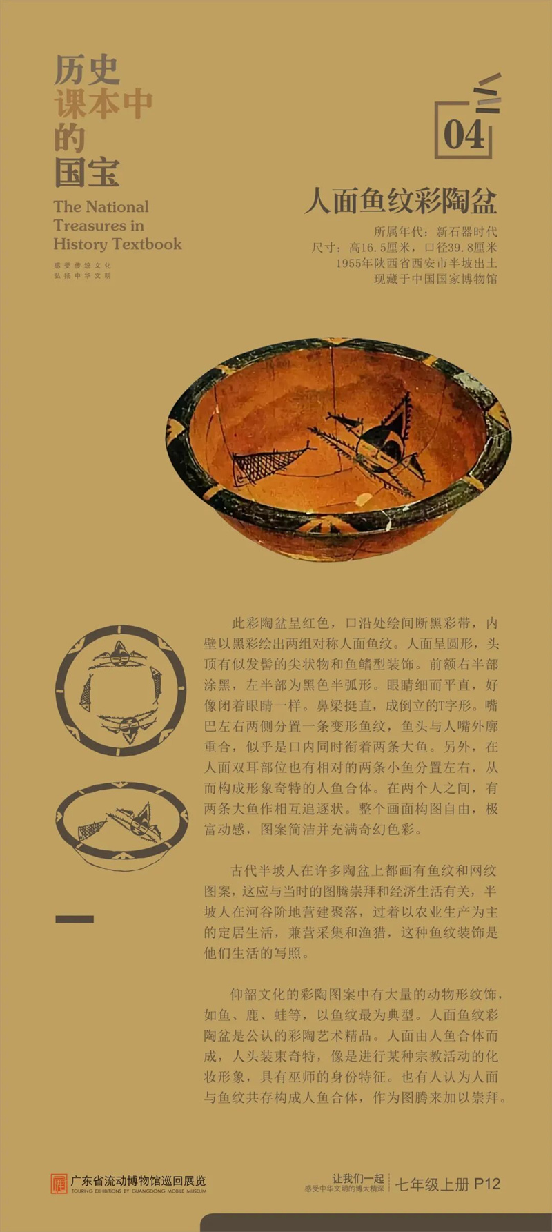 “历史课本中的国宝”是东莞市博物馆首次对接中学历史课本内容设计的流动展览,从历史课本中甄选25件具有重大历史、文化、艺术价值的古代文物,通过图片展讲述“国宝”的前世今生,在课本知识之外呈现新的历史风貌和价值精髓,给同学们提供一架“时光机”,在“时光通道”中感受中华文明之大美。