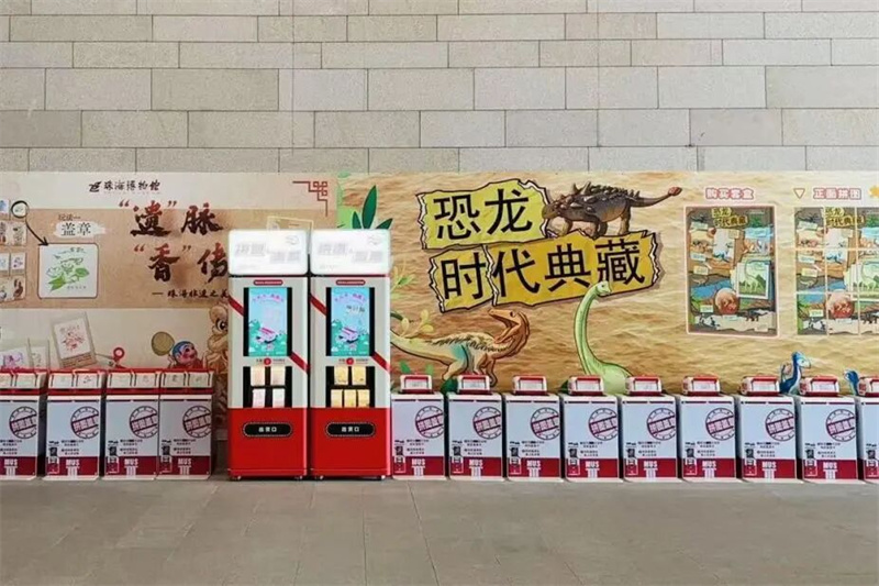 文创自动售货机:纪念币、冰箱贴、“恐龙时代典藏”“‘遗’脉‘香’传——珠海非遗之美”盖章套卡和恐龙有声冰箱贴等丰富的文创产品
