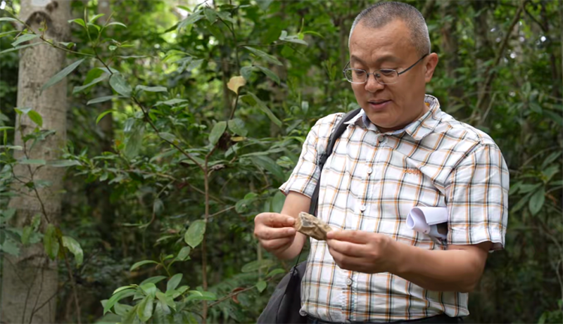 深圳福田区的沙嘴遗址在四普登记表中被标注为商周时期的古文化遗址。专家组一行在河边踏勘时,吉笃学偶然捡到一块石头,他当即判断,这可能是一件石锛的刃部残片,它的年代可能与所登记的时期相符,大致就在商周时期。但随后,他在树下又发现了一块小瓷片,大约只有两厘米见方。